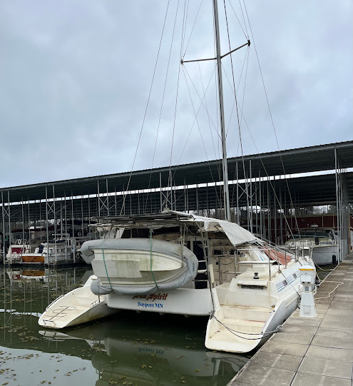 We are having a lovely warmup, with an overnight low of 57F last night and a high of 78F today. The rain we’re expecting won’t arrive until tonight, now, so we were able to take a long walk around the marina, boat yard, RV park and surrounding grounds, then borrowed the courtesy van to provision in town. The marina is all decorated for the holidays, and hosts an annual Christmas on the River lighted water parade, which we missed by a week. The marina is also home to my friend Perry Phillips’ 40-foot sailing catamaran, Sun Spirit. I’ve done two offshore deliveries aboard Sun Spirit: from St. Thomas, USVI, to Mobile, AL, and Mobile to Miami, and have very fond memories of those voyages.