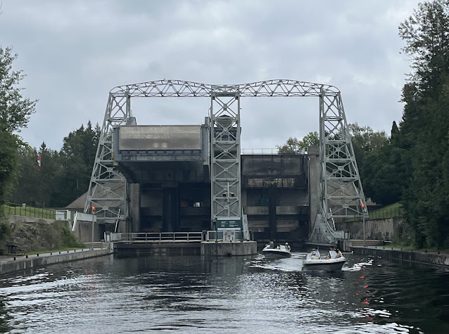 We timed our morning departure to cross Cameron Lake and arrive at Lock 36 in Rosedale (a name we know well) when it opened at 9:00 AM. The doors swung open on the hour, we were lifted four feet and were on our way at 9:09 AM. Rosedale is the last lift on the Trent-Severn, then we were on Balsam Lake, the last of the Kawartha Lakes and the highest point on the Waterway, at 598 feet above Lake Ontario and 841 feet above sea level. From Balsam Lake, we entered the narrow, shallow Trent Canal, dug by hand through the Canadian Shield granite. Our first step on the 260-foot drop down to Lake Huron was the Kirkfield Lift Lock, which operates just like the Peterborough Lock, with two pans of water moving vertically on hydraulic pistons. The Kirkfield Lock is different, in that it is less enclosed and you are going down (49 feet), looking out over the edge of the pan above the canal below. It’s pretty cool!